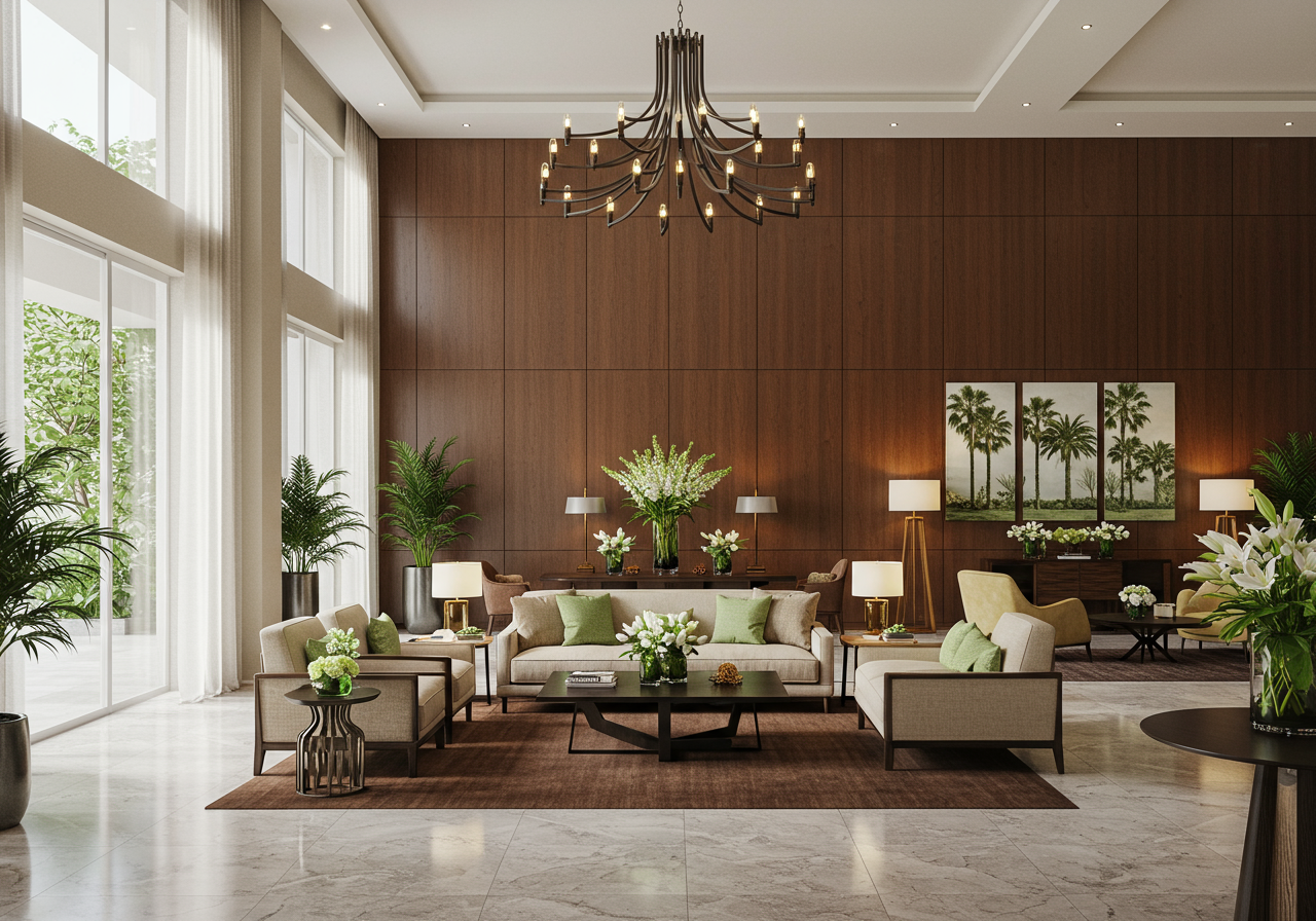 Beautiful lobby with chandelier created by artist and design legend, Tony Duquette