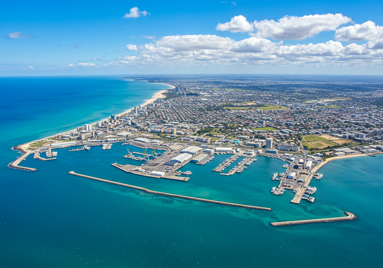 Aerial view of Honolulu, Hawaii, on an overcast and rainy day. Focus on Pearl Harbor.