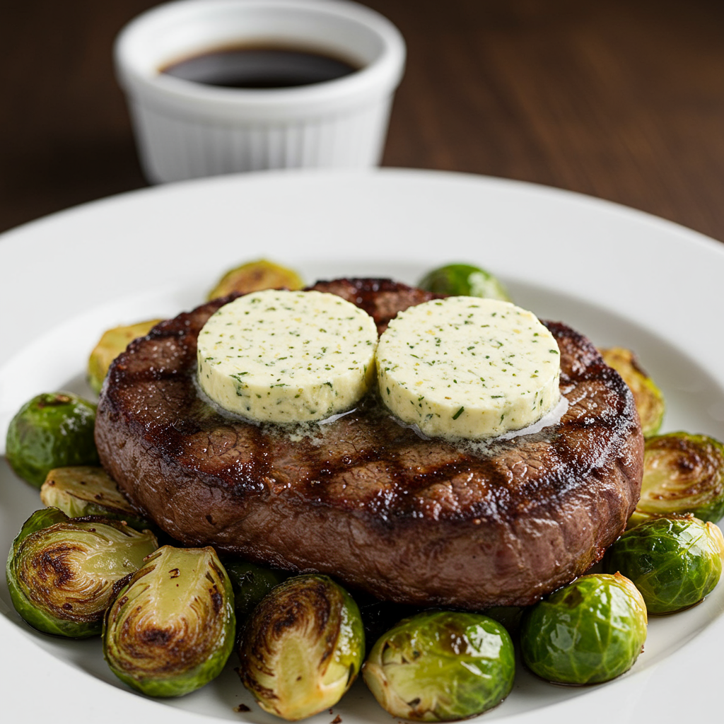 30-Day Dry-Aged Boneless Rib Eye with Rosemary jus, Roasted Brussel Sprouts, and Bone Marrow butter