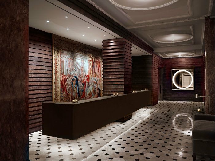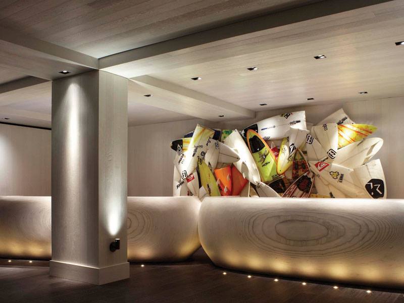One of the things they are known for is having a statement piece or two that stands out in a mostly neutral palette, like the very artful hotel front desk made of an oak wood that is stained white to let its natural beauty come through.